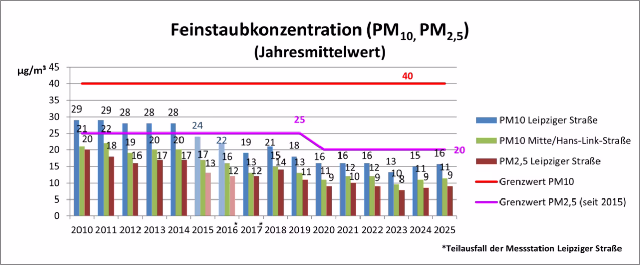 Plánem čistého ovzduší, který byl naposledy aktualizován v roce 2011, položilo město Chemnitz základ pro trvalé zlepšování kvality ovzduší a snižování znečištění oxidem dusičitým (NO2). Opatření přijatá městskou radou se osvědčila: