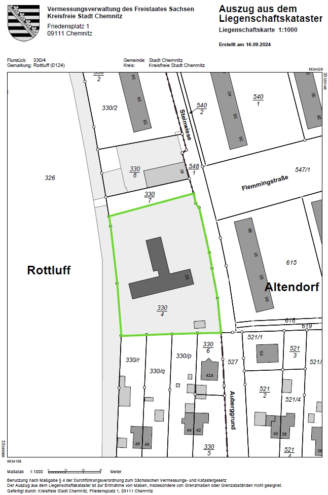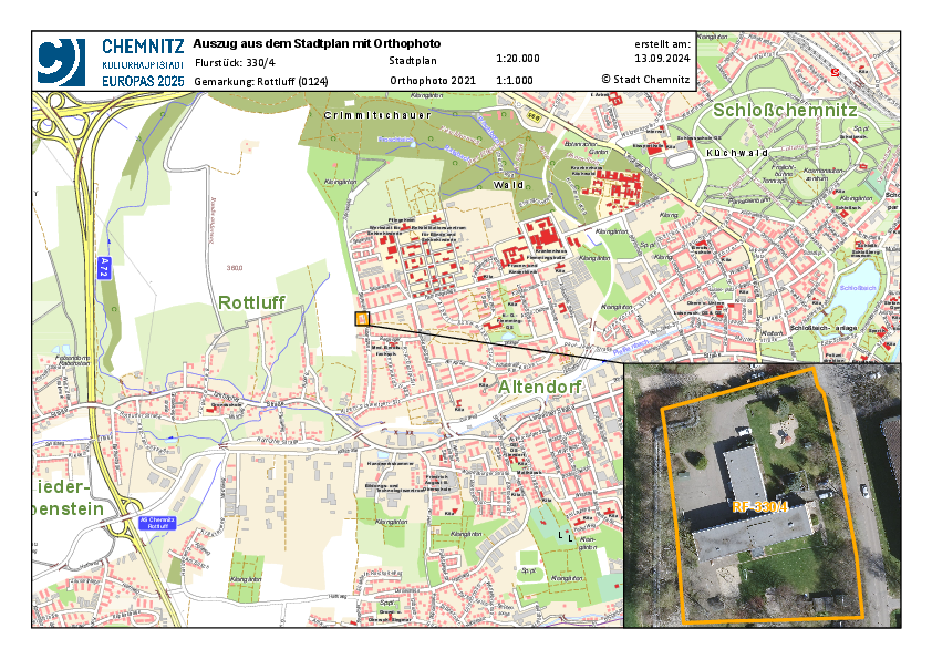 Vlastník pozemku: Pozemek se nachází ve čtvrti Chemnitz Altendorf na ulici Flemmingstraße s nízkou intenzitou dopravy. Je obklopen obytnou zástavbou, zahrádkářskými spolky, areálem nemocnice a zemědělskou půdou. Je zde dobré dopravní spojení jak do centra města, tak do okolí. V docházkové vzdálenosti se nachází zastávka městské hromadné dopravy. Přes různé křižovatky je napojení na spolkové dálnice 4 a 72.