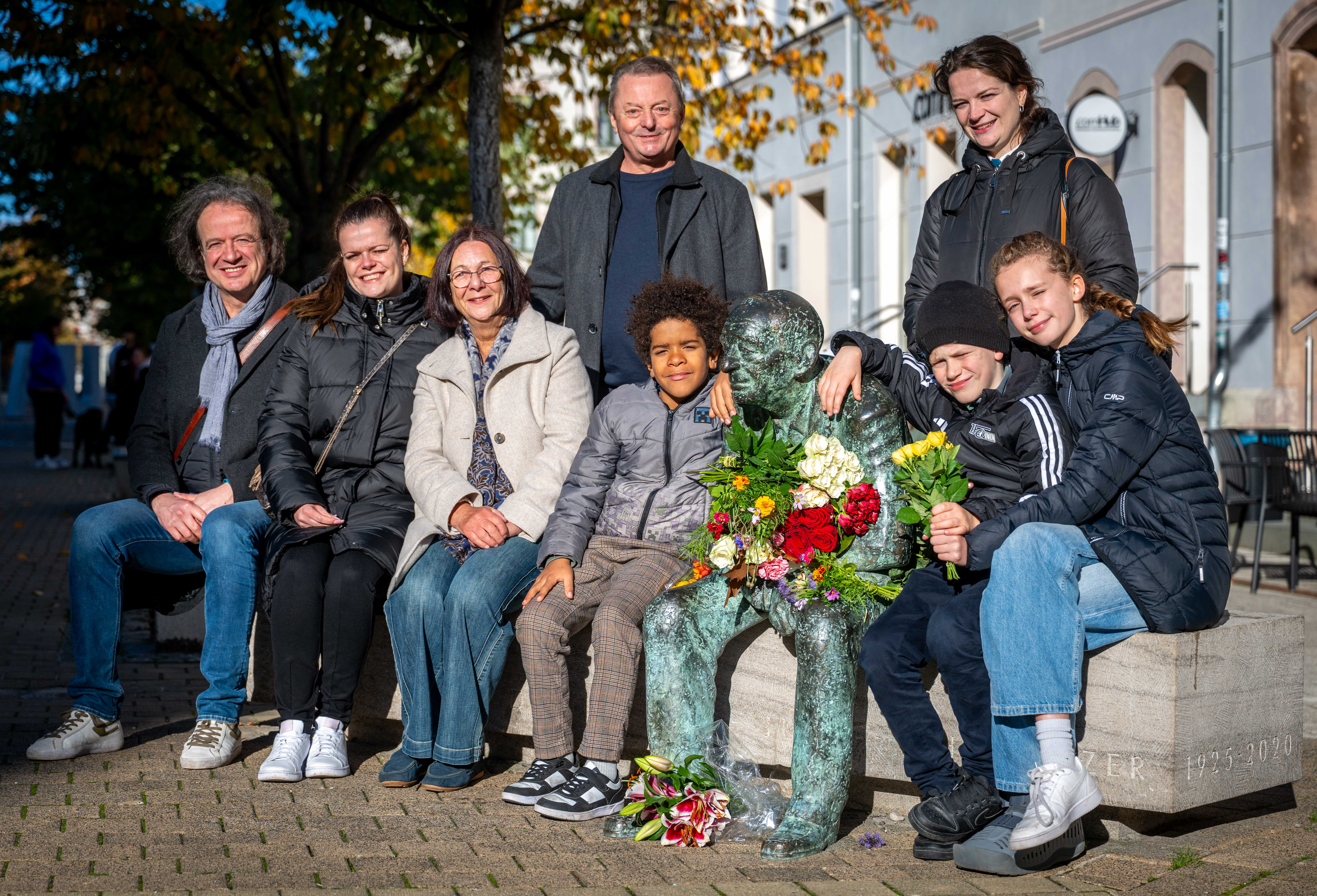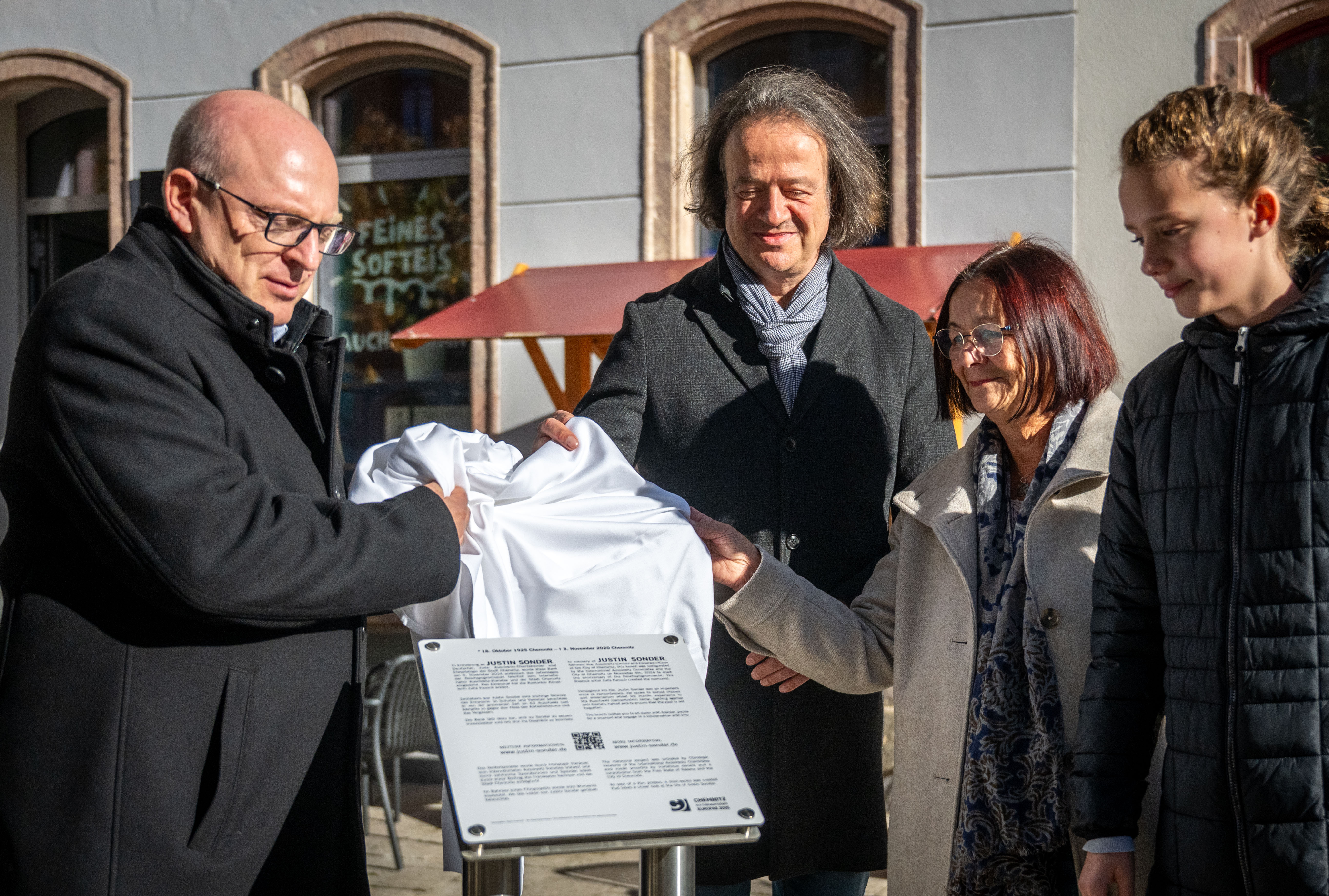 Aus diesem Anlass weihten Oberbürgermeister Sven Schulze, Justins Sonders Tochter Kerstin Claus, sein Sohn André Sonder und Urenkelin Lina Sonder eine neue Infostele zu Justin Sonder ein.
