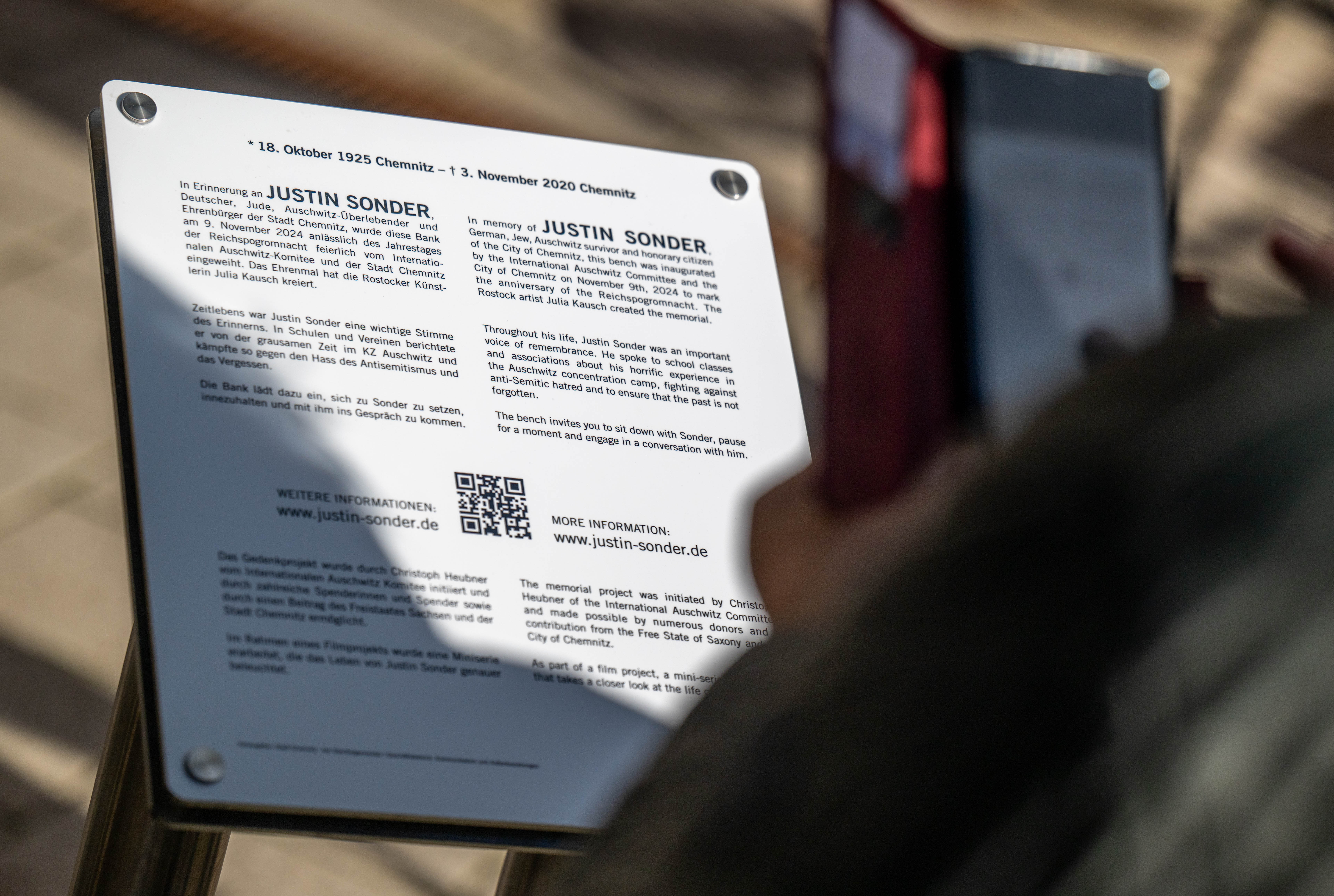 Das internationale Auschwitz-Komitee und die Stadt Chemnitz möchten an den Chemnitzer Ehrenbürger Justin Sonder in seiner Heimatstadt erinnern. Eine Skulptur, die Justin Sonder sitzend auf einer Bank darstellt, wurde dazu am 9. November 2024 auf dem Brühl aufgestellt. Diese soll dazu einladen, sich dazuzusetzen und mit ihm gedanklich ins Gespräch zu kommen.