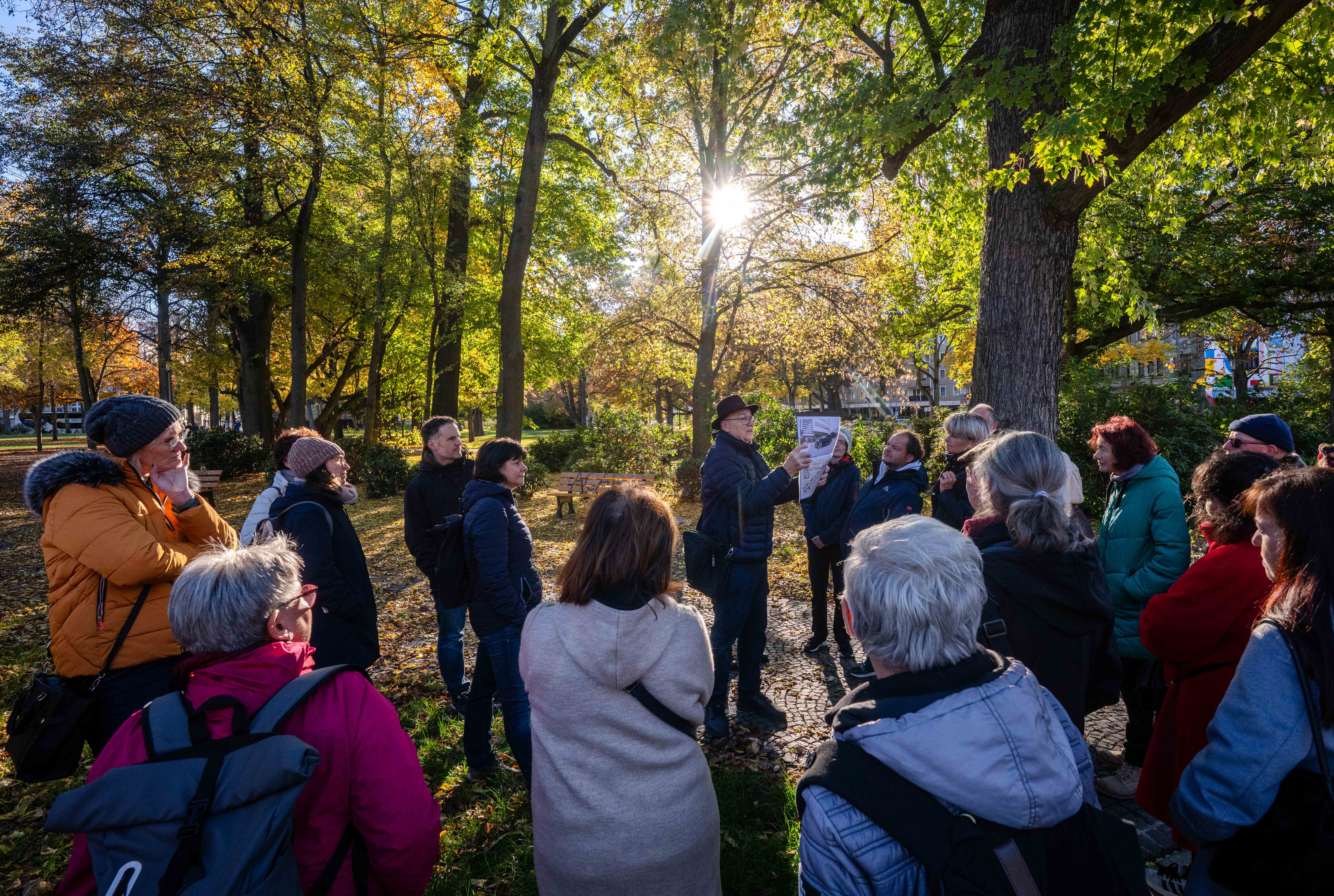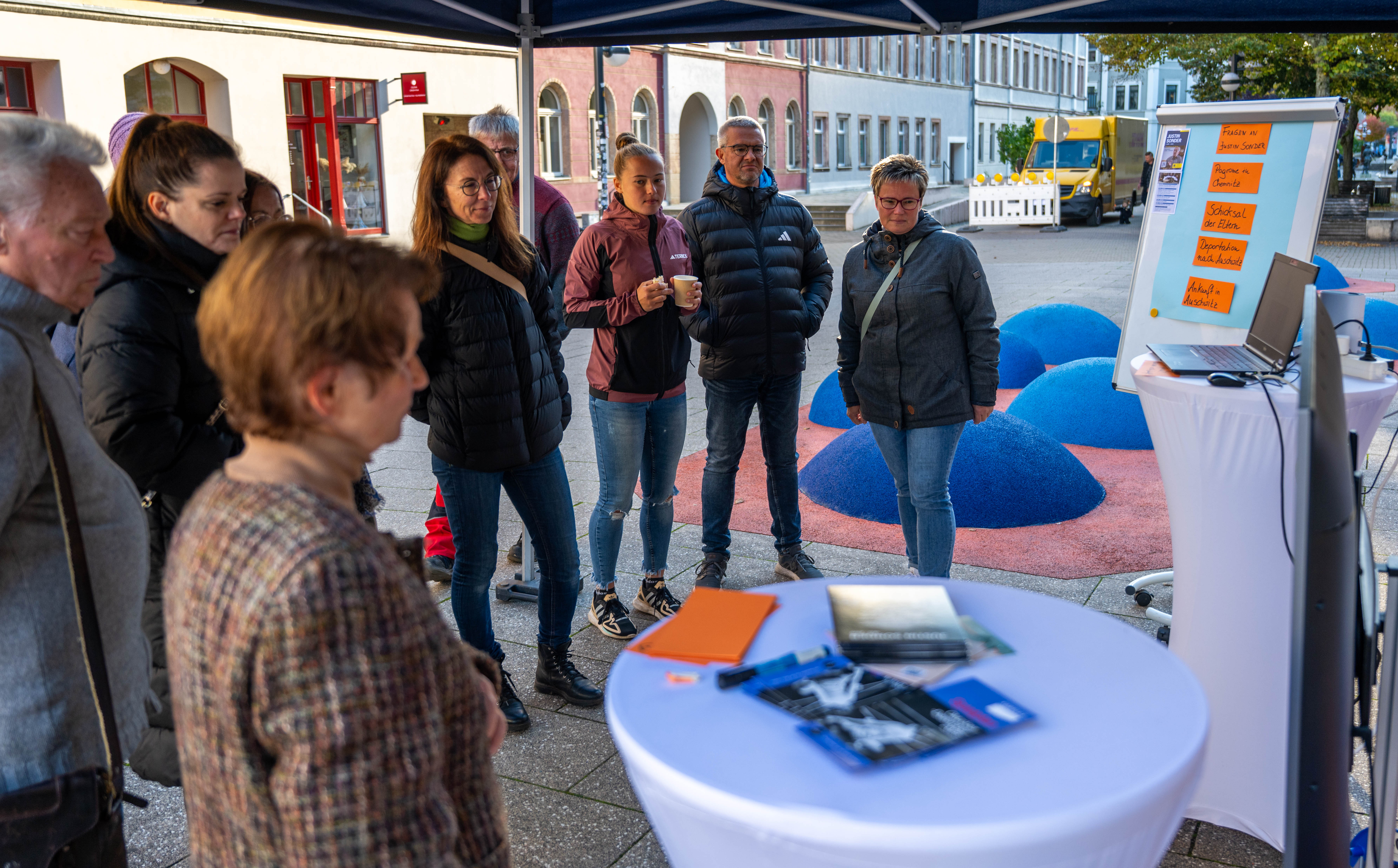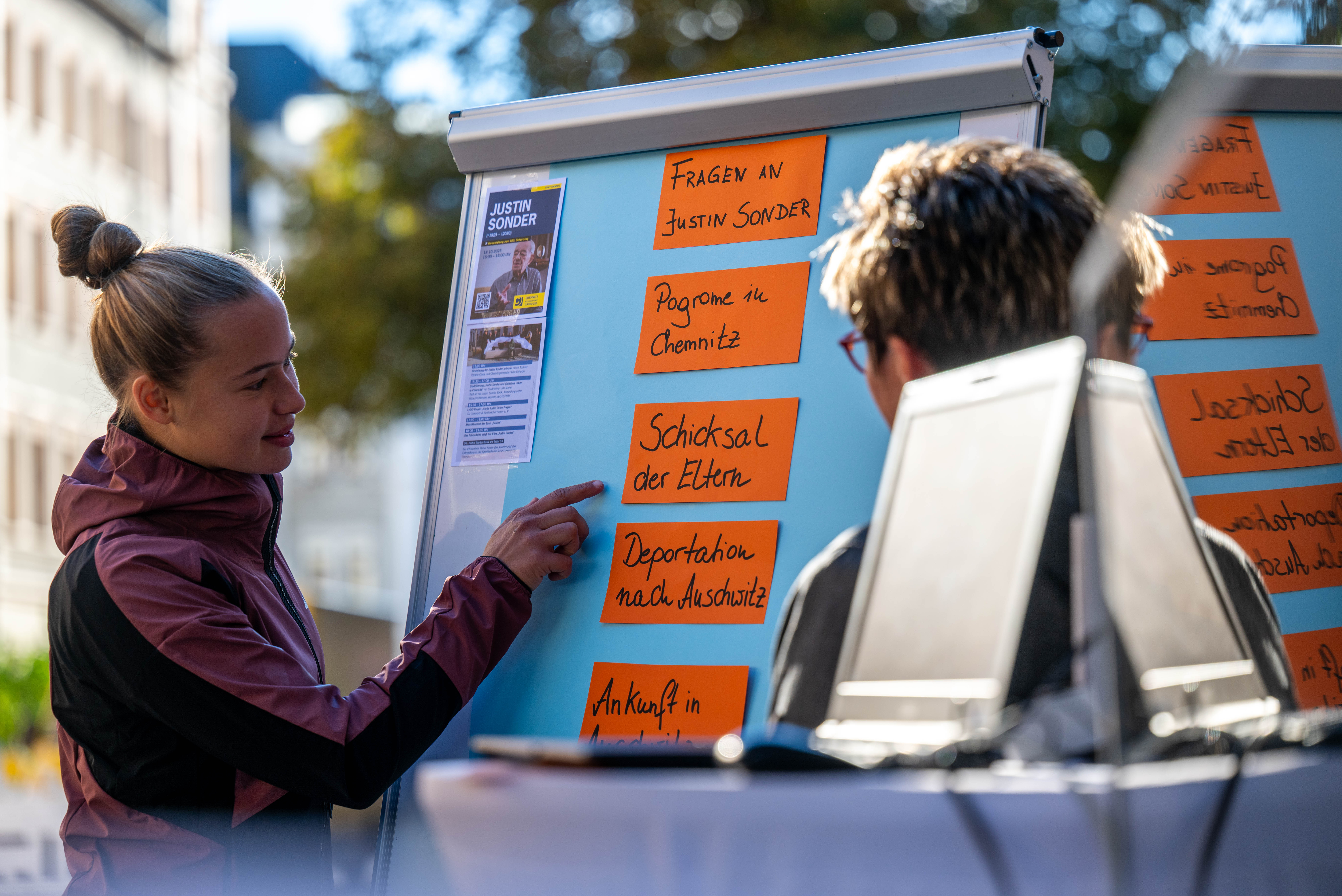 Im Anschluss konnten Besucher:innen an Aktionen der TU Chemnitz und des Buntmacher*innen e. V. auf dem Brühl teilnehmen. Stadtführer Udo Mayer lud zu einer Stadtführung zum Thema „Justin Sonder und jüdisches Leben in Chemnitz“.