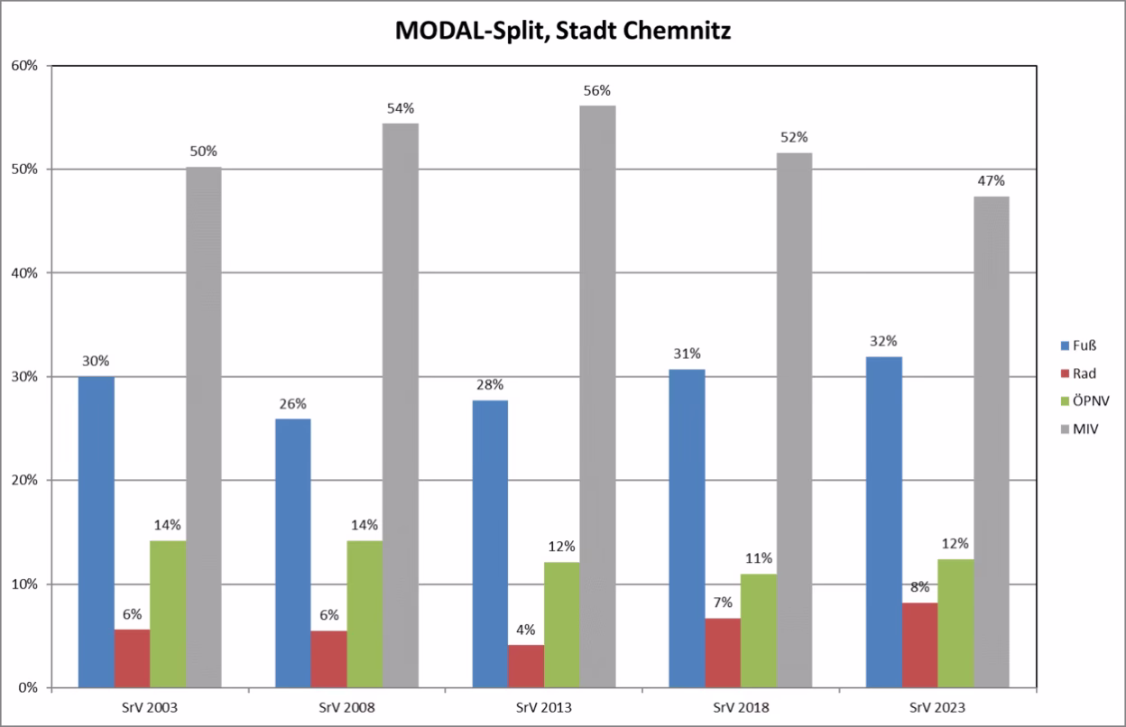 Die Ergebnisse des SrV 2023 zeigen, dass in Chemnitz der Wegeanteil, welcher mit dem Pkw (MIV) durchgeführt wird, weiter auf 47% gesunken ist.