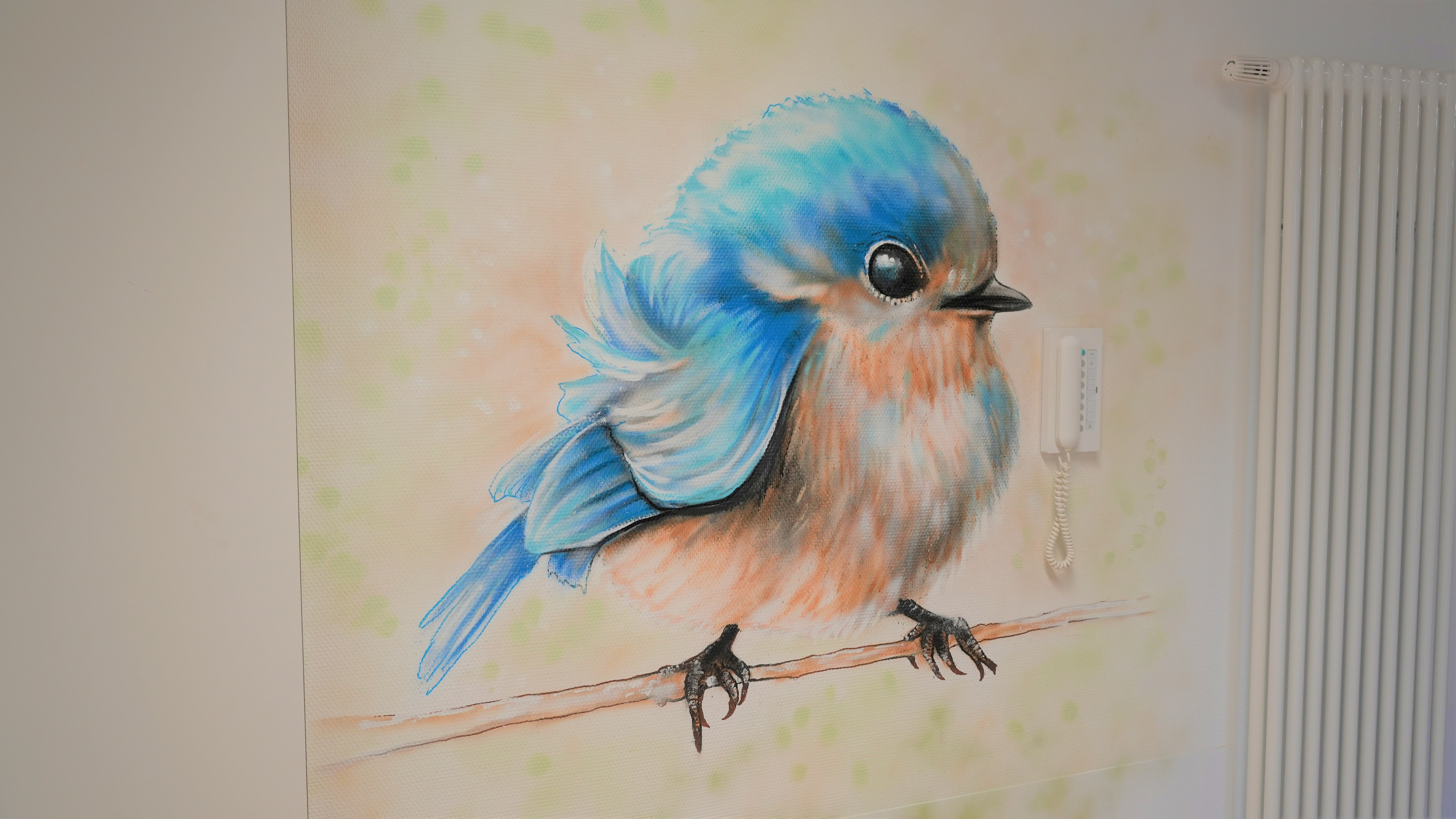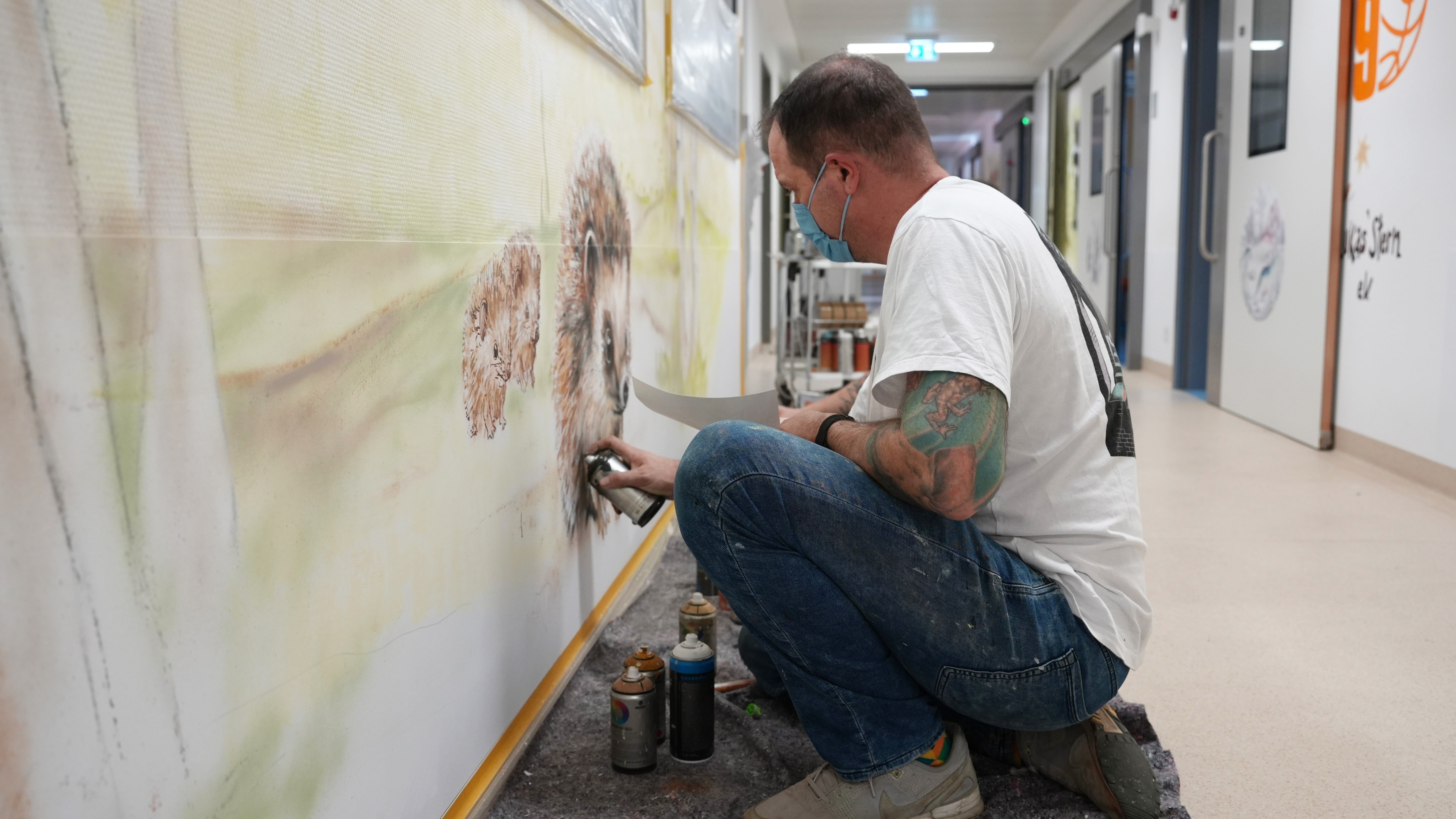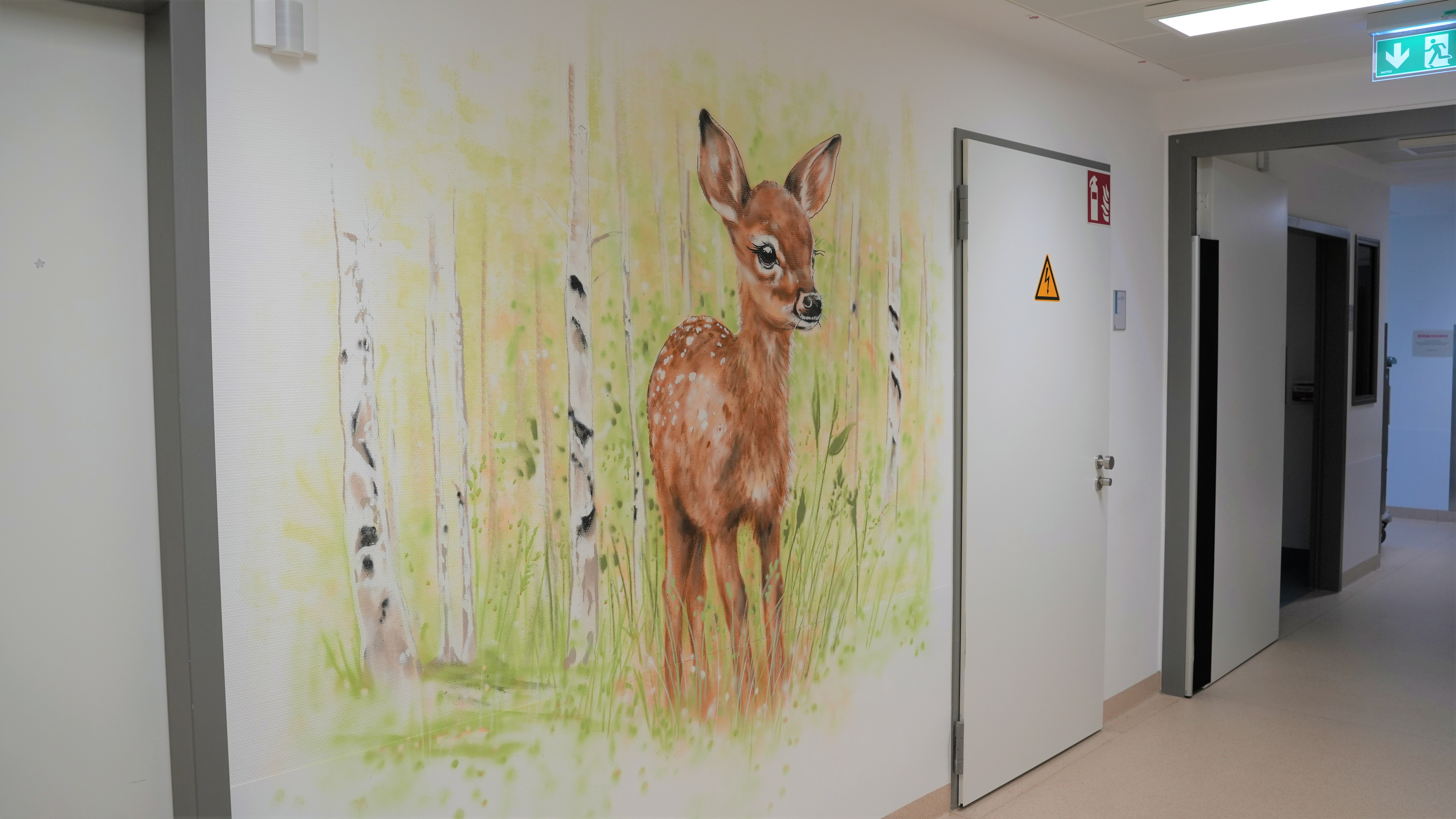 Thanks to sponsorship from Niners Chemnitz and Lukas Stern e. V., an artistic graffiti project has been realised that gives the corridor areas a new, warm atmosphere. Pictures of animal children such as a fawn, a raccoon, a sparrow and a hedgehog were created in a natural setting. This colourful wall art creates an environment that provides calm and strength in emotionally turbulent times.