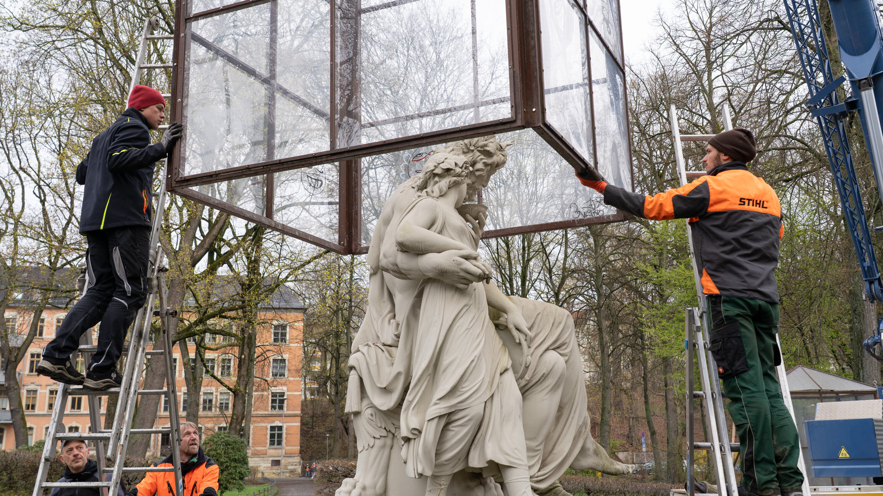 On Tuesday (31 March), the Schilling figures in the park by the castle pond were freed from their winter protection. The team from the Parks Department led by Erik Wagner removed the enclosures with great sensitivity - supported by a mobile crane.